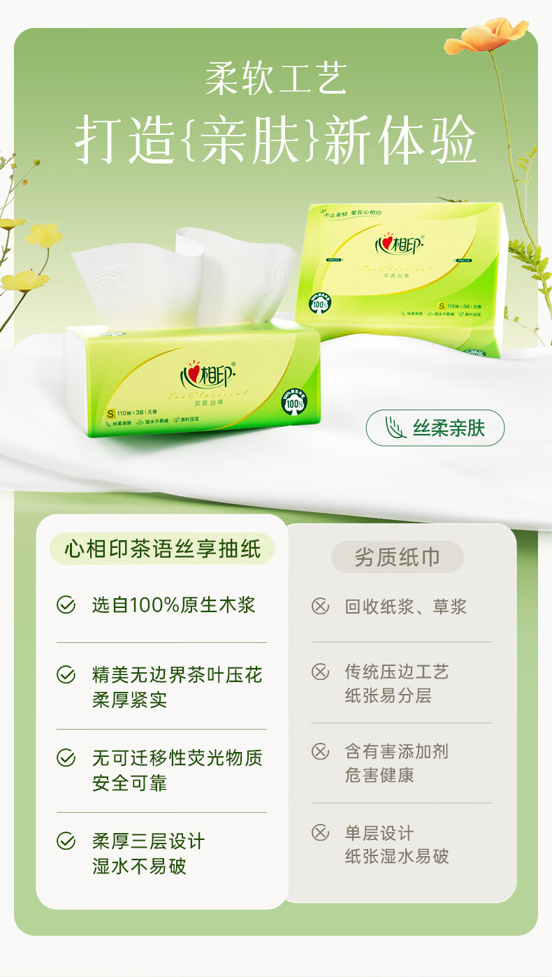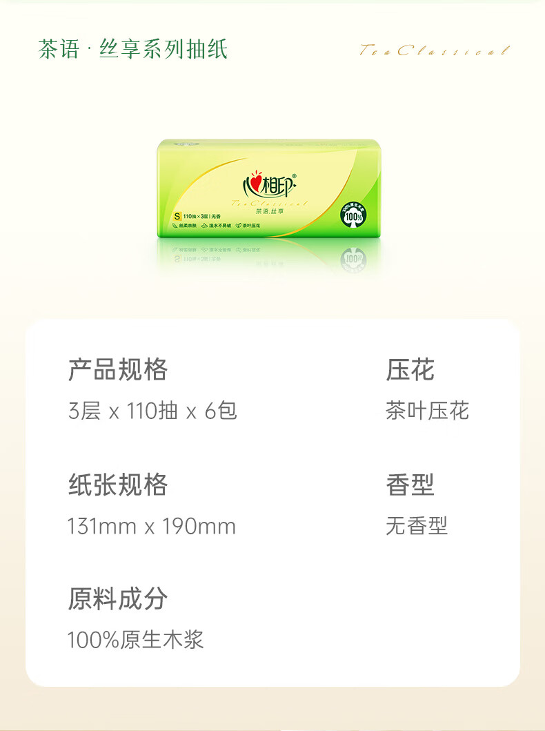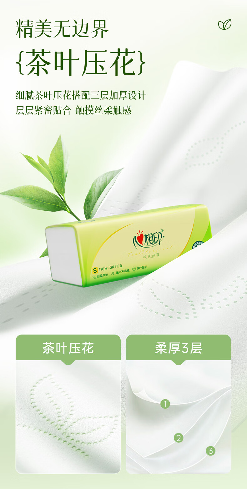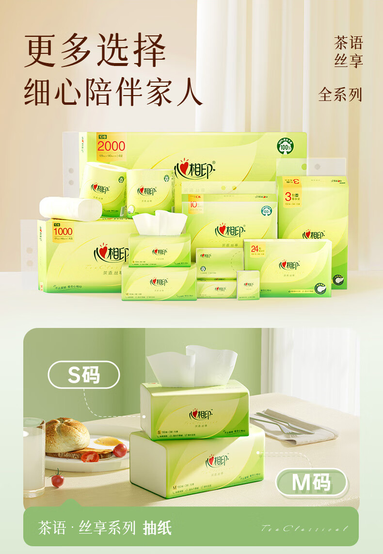 心相印抽纸茶语丝享 3层660抽 真S码 柔厚亲肤 纸巾提装